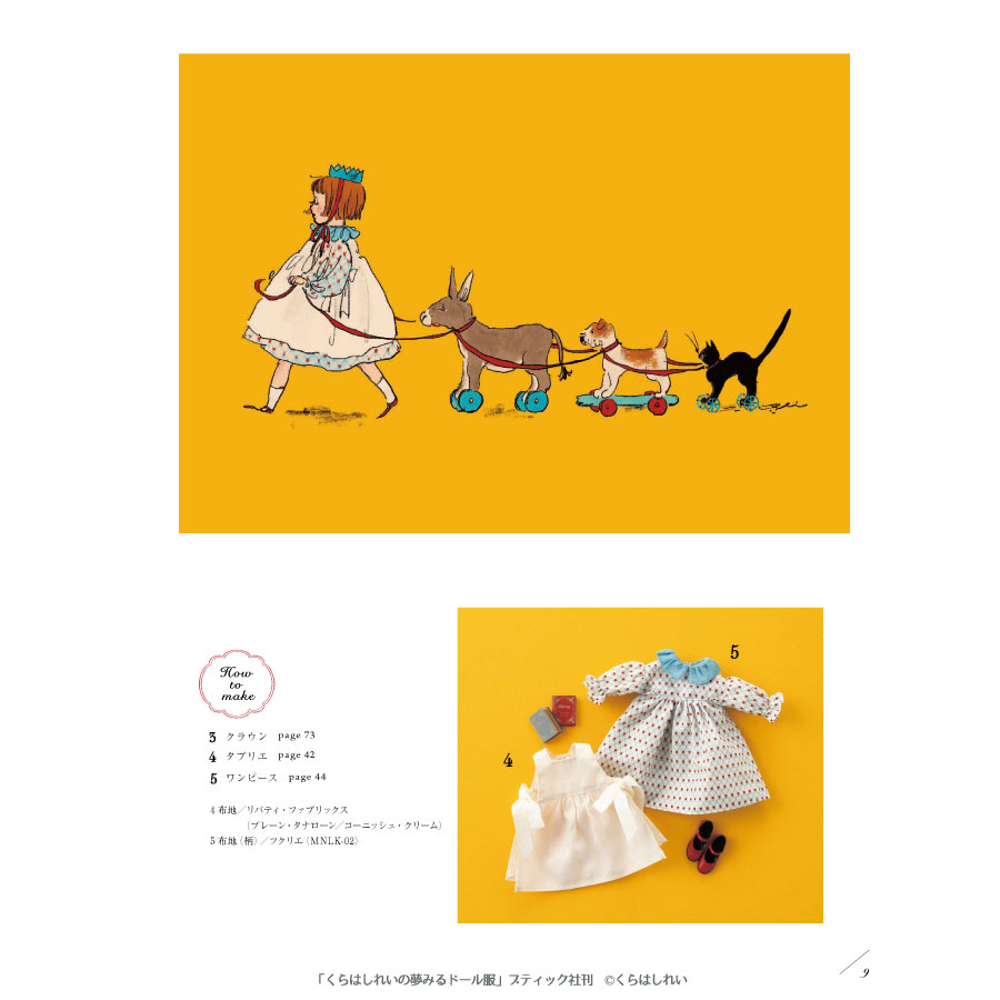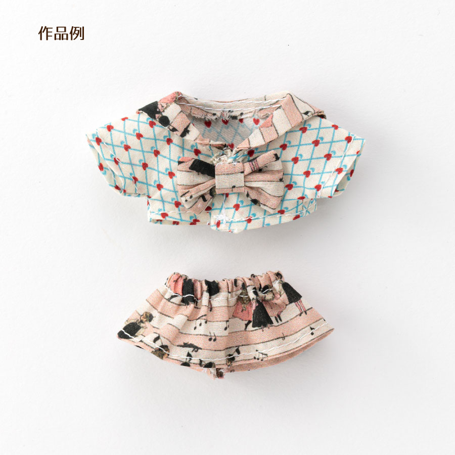 幅約34cm、長さ50cmの生地上に、通常サイズの生地の柄をミニチュアサイズに縮小した柄の生地とくらはしれいさんの描くお洋服の柄を再現した生地の2柄がプリントされています。