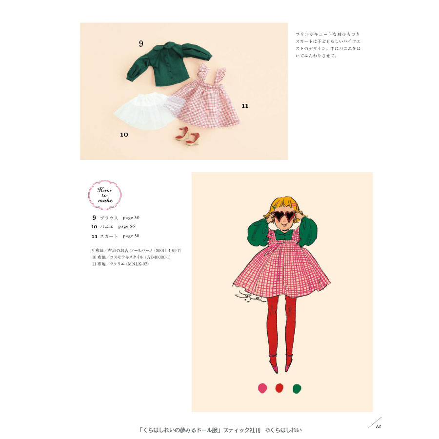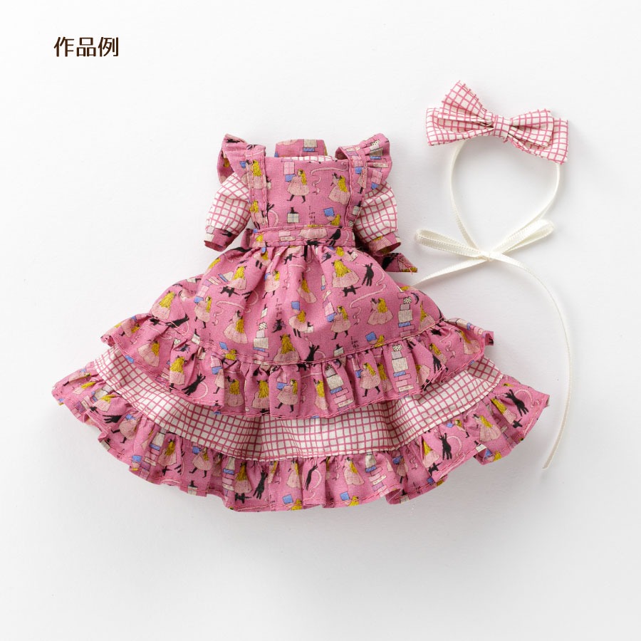 幅約34cm、長さ50cmの生地上に、通常サイズの生地の柄をミニチュアサイズに縮小した柄の生地とくらはしれいさんの描くお洋服の柄を再現した生地の2柄がプリントされています。