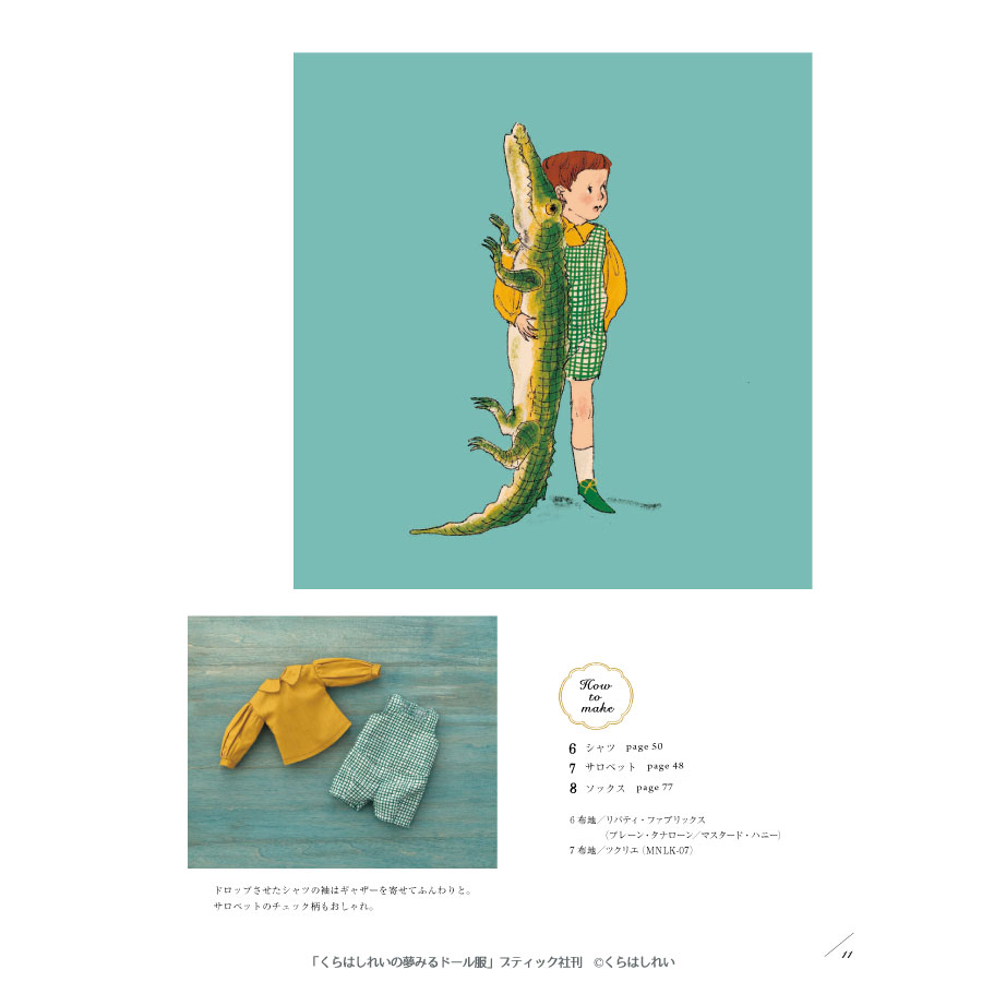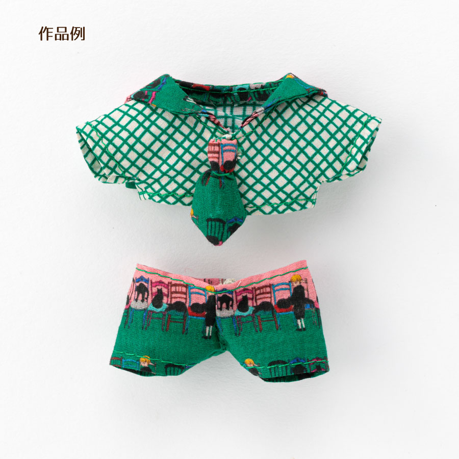 幅約34cm、長さ50cmの生地上に、通常サイズの生地の柄をミニチュアサイズに縮小した柄の生地とくらはしれいさんの描くお洋服の柄を再現した生地の2柄がプリントされています。