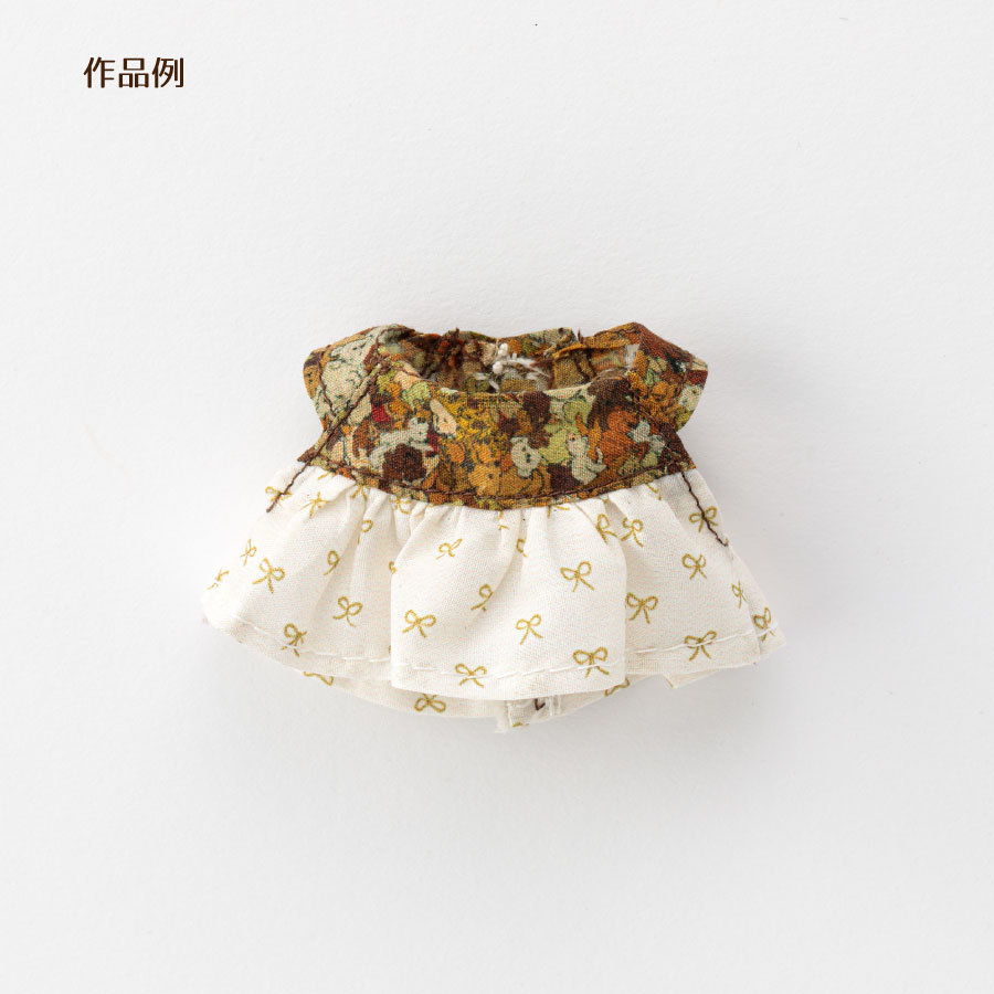 幅約34cm、長さ50cmの生地上に、通常サイズの生地の柄をミニチュアサイズに縮小した柄の生地とくらはしれいさんの描くお洋服の柄を再現した生地の2柄がプリントされています。