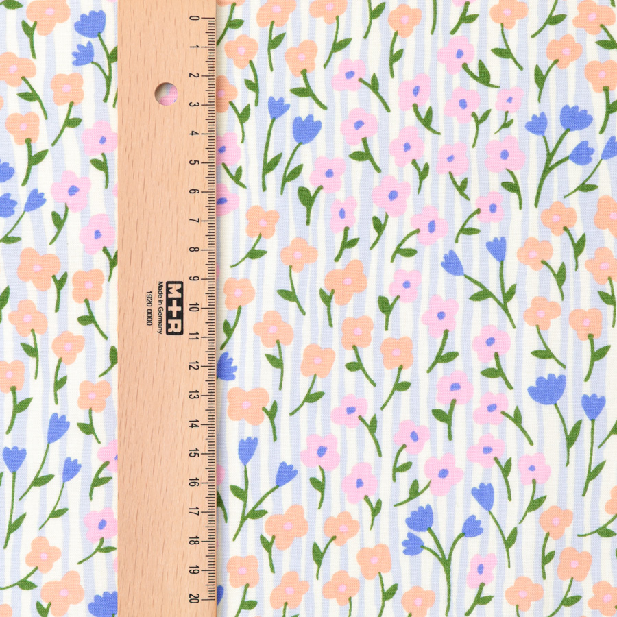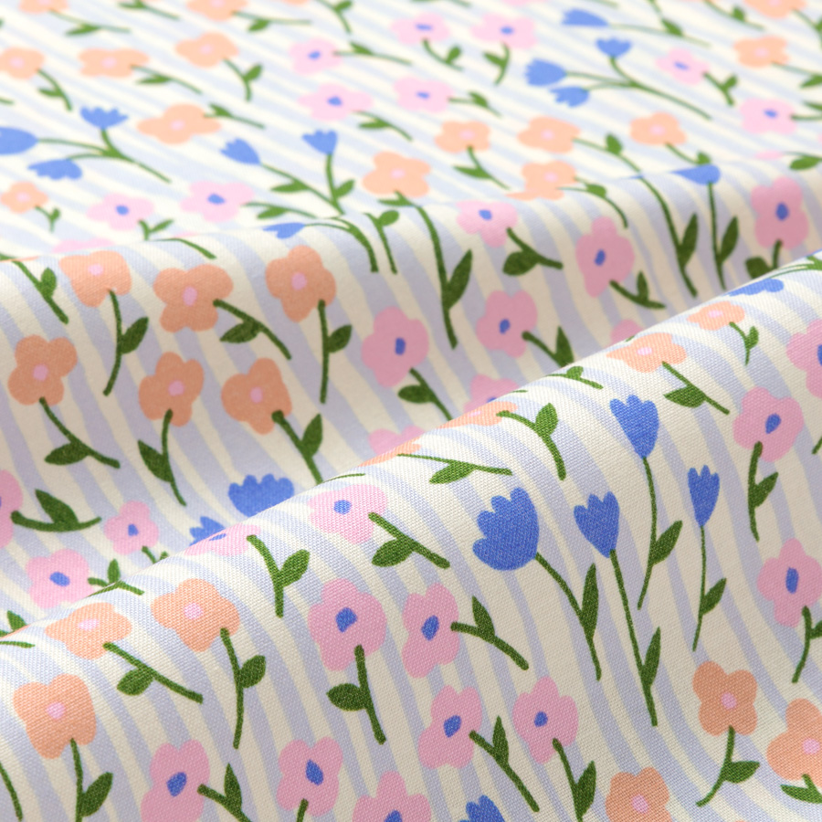 ゆるやかなフリーハンドのストライプと、思いのままに描いた花々は、可憐さと躍動感を合わせもつ、自由でのびのびとしたデザインです。