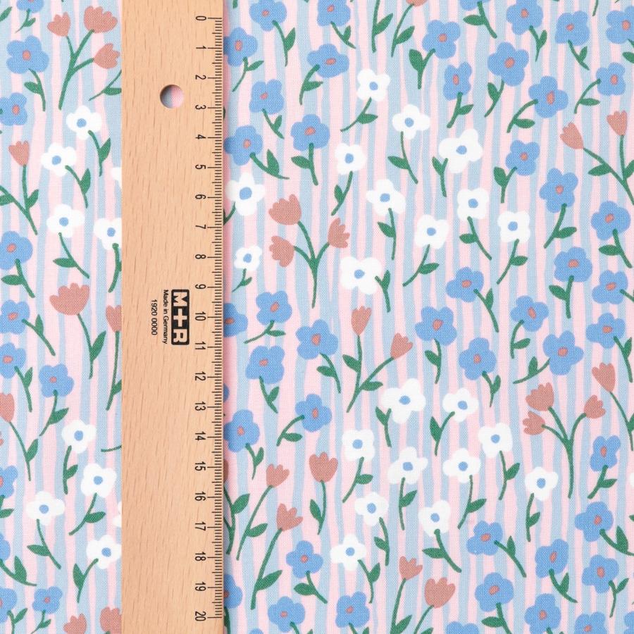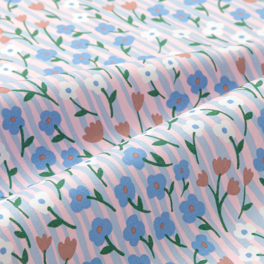 ゆるやかなフリーハンドのストライプと、思いのままに描いた花々は、可憐さと躍動感を合わせもつ、自由でのびのびとしたデザインです。